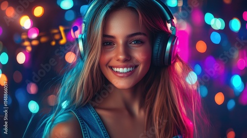 woman, earphones, music, colourful, young, smile, happy, light, vibrant, joy, listening, audio, sound, leisure, fun, party, nightlife, blond, long hair, denim, aesthetic, radiant, playful, atmosphere, neon, glowing, electronic, youthful, energetic, bright, entertainment, dynamic, celebration, enjoying, setting, cheerful, artistic, charismatic, trendy, caucasian, casual attire, enjoyment, modern, relaxation, captivating, festive, bokeh, fashion