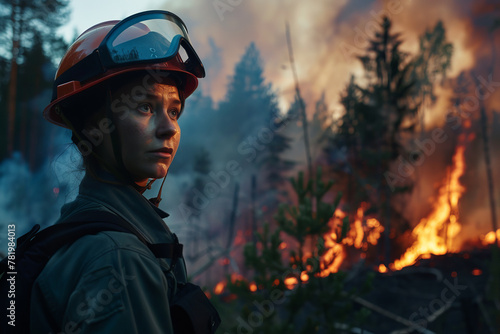 young caucasian woman firefighter in uniform stands near the forest fires, natural background