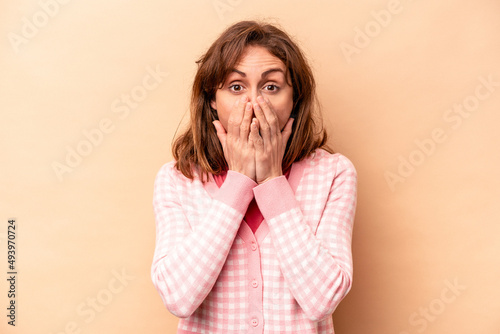 Young caucasian woman isolated on beige background shocked, covering mouth with hands, anxious to discover something new.