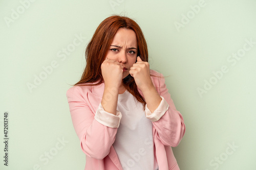 Young caucasian woman isolated on green background throwing a punch, anger, fighting due to an argument, boxing.