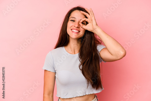 Young caucasian woman isolated on pink background excited keeping ok gesture on eye.