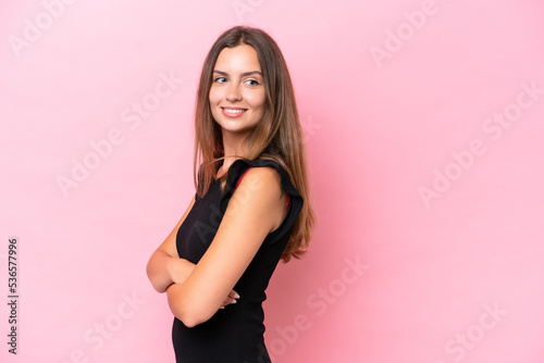 Young caucasian woman isolated on pink background looking to the side and smiling