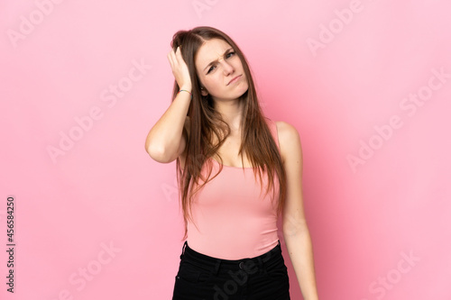 Young caucasian woman isolated on pink background with an expression of frustration and not understanding