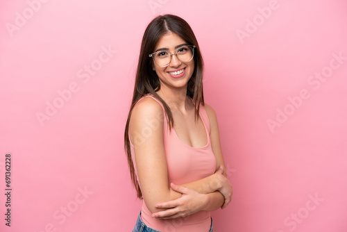 Young caucasian woman isolated on pink background with arms crossed and looking forward