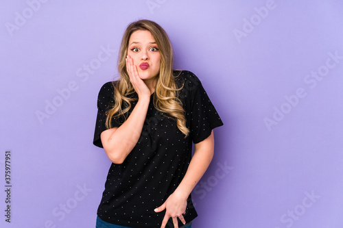 Young caucasian woman isolated on purple background blows cheeks, has tired expression. Facial expression concept.