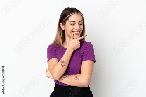 Young caucasian woman isolated on white background looking to the side and smiling