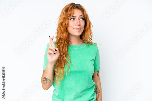 Young caucasian woman isolated on white background with fingers crossing and wishing the best