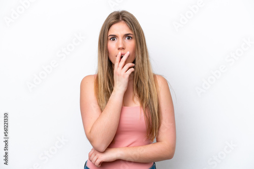 Young caucasian woman isolated on white bakcground surprised and shocked while looking right