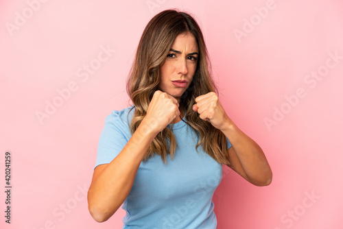 Young caucasian woman isolated showing fist to camera, aggressive facial expression.