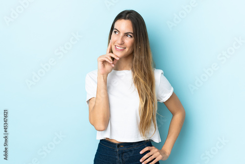 Young caucasian woman over isolated background thinking an idea while looking up