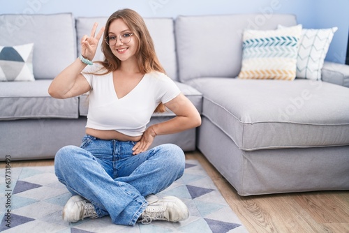 Young caucasian woman sitting on the floor at the living room smiling looking to the camera showing fingers doing victory sign. number two.