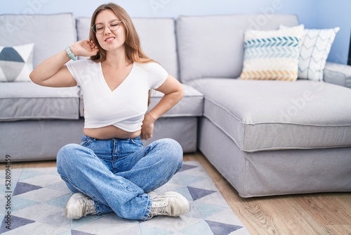 Young caucasian woman sitting on the floor at the living room stretching back, tired and relaxed, sleepy and yawning for early morning