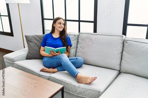 young, caucasian, woman, girl, female, beautiful, person, portrait, adult, attractive, happy, happiness, confident, cheerful, confidence, looking, cool, smile, lifestyle, expression, positive, joy, smiling, enjoy, fun, sitting, sofa, read, reading, book, literature, leisure, study, studying, smart, intelligent, holding, home, house, apartment, living room, room, interior, background