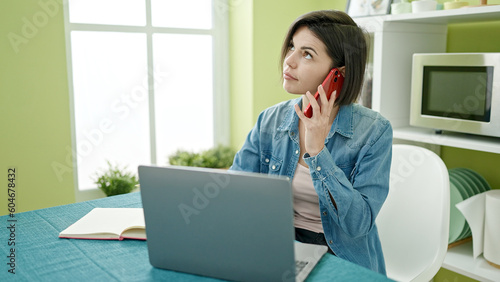 Young caucasian woman talking on smartphone using laptop at home