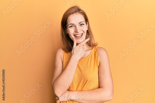 Young caucasian woman wearing casual style with sleeveless shirt looking confident at the camera smiling with crossed arms and hand raised on chin. thinking positive.