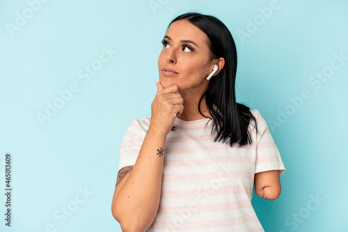 Young caucasian woman with one arm listening to music with wireless headphones isolated on blue background looking sideways with doubtful and skeptical expression.