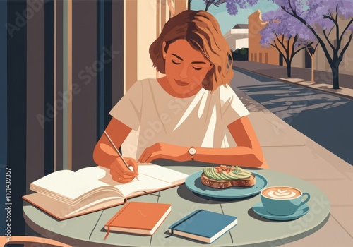 woman, writing, journal, coffee, avocado, young, caucasian, hot drink, breakfast, book, relaxation, leisure, morning, terrace, street, notebook, tree, urban, daylight, lifestyle, casual attire, thoughtful, peaceful, solitude, serenity, contemplative, creativity, inspiration, city, dining, brunch, open air, fashionable, modern, contentment, patio, vibrant, artistic, personal, tranquil