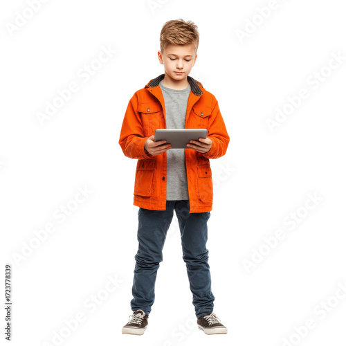 boy, children, central, asian, male, youth, children, jacket, orange, coat, t-shirt, jean, tablet, device, screen, technology, education, learning, app, promo, commercial, stock, photo, image, racked, standing, pose, front view, transparent, background, white, casual attire, outfit, portrait, marketable, scene, communication