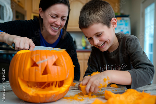 autumn, house, indoor, jack-o-lantern, constructed, mother, mother, october, orange, eltern, home, party, preparing, process, season, smiling, instructing, tradition, trick or treat, preparation, holiday, children, having fun, celebration, help, create, creative, cut, decoration, fall, festival, halloween, carve, hand-made, happy, boy, children, childhood, symbol, costume, food, hat