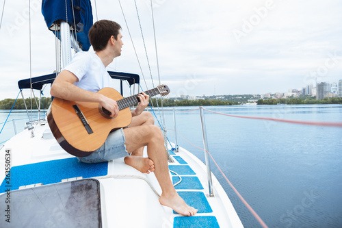 Young cheerful man playing guitar at boat party outdoor, smiling and happy. Adventure in sea tour, youth and summer vacation concept. Alcohol, vacation, resting, music concept. Good vibes and emotions