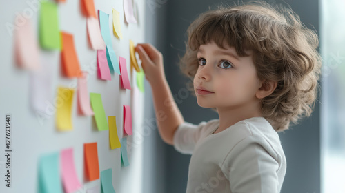 Young child concentrating on arranging colorful sticky notes on a whiteboard, demonstrating organizational skills and thoughtful planning