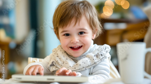 Young child smiles while using laptop computer at table with christmas tree in the background.