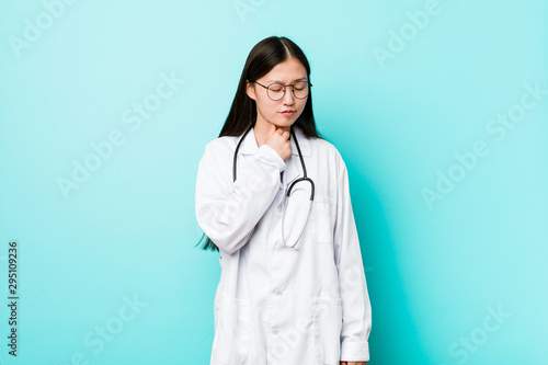 Young chinese doctor woman suffers pain in throat due a virus or infection.