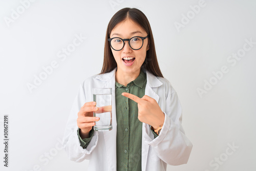 Young chinese dooctor woman wearing glasses drinking water over isolated white background very happy pointing with hand and finger