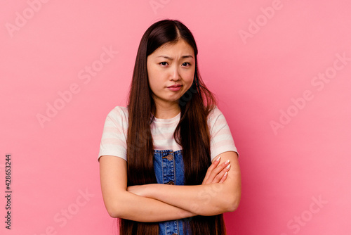 Young chinese woman isolated on pink background unhappy looking in camera with sarcastic expression.