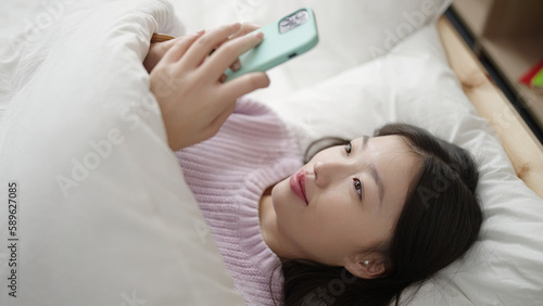 Young chinese woman using smartphone lying on bed at bedroom