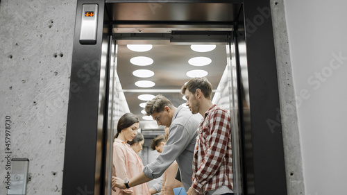 Young colleagues going inside elevator, office employees in business center