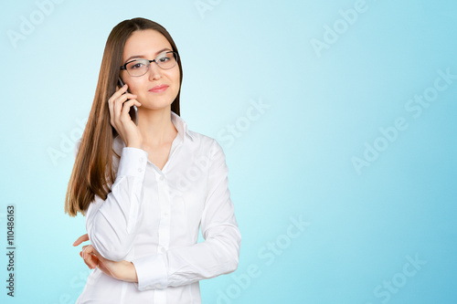 Young, confident, successful and beautiful business woman with the mobile phone isolated