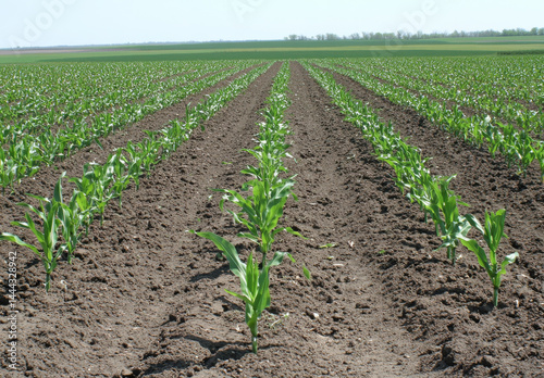 Young corn plants sprout from rich soil in vast agricultural field, showcasing rows of vibrant green growth under clear sky. scene evokes sense of hope and abundance