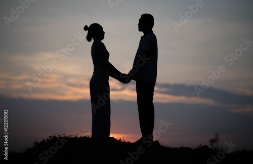 Young couple Hand in hand at sunset on the Mountain