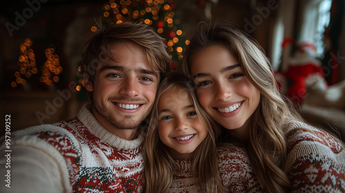 Young couple and their kids, all wearing matching Christmas clothes, taking selfie in beautifully lit Christmas tree