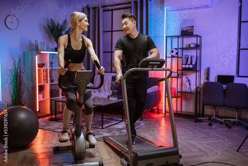 Young couple doing cardio on stationary bike and treadmill. Attractive female and male working out on fitness at evening time at home. Woman training on exercise bike and man running on treadmill.