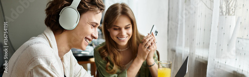 man, woman, couple, loving, beautiful, photogenic, home, cosy, comfy, modern, home, young, happiness, technology, sharing, activity, laughter, together, morning, intimacy, connection, joy, smile, engagement, friendship, decor, casual attire, atmosphere, relaxation, comfort, fun, conversation, partnership, lifestyle, companionship, happy, playful, moment, beauty, creativity, interior, space, beverage, bliss, dream