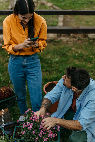 gardening, couple, outdoors, flower, bonding, technology, smartphone, teamwork, planting, nature, hobby, leisure, relaxation, communication, lifestyle, interaction, garden, plant, friendship, activity, collaboration, enjoyment, greenery, spring, summer, connection, casual attire, happiness, horticulture, cultivation, digital, companionship, peaceful