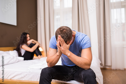 Young couple having a problem. Handsome man is leaning on his hand while sitting sadly on bed, woman is lying in the background