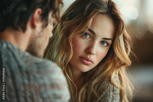 couple, intimate, young, woman, man, closeup, portrait, love, human relationships, emotion, connection, blond, hair, attractive, focused, gaze, serious, warm, light, indoor, casual attire, soft, natural light, candid, togetherness, romantic, bonding, conversation, depth of field, bokeh, blurred background, affectionate, sincerity, trust, mood, personal, moment, relaxed, cosy, emotional, youthful, expressive, engaging, beauty, serene