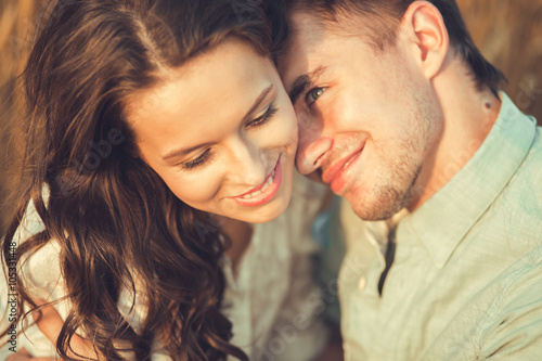 Young couple in love outdoor.Stunning sensual outdoor portrait of young stylish fashion couple posing in summer in field