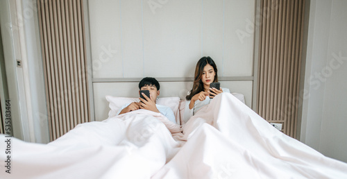Young Couple lying on bed with smartphone ignoring each other