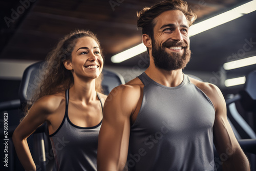 Young couple running on treadmills in modern gym. healthy lifestyle