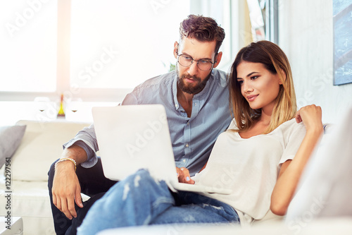 beautiful, caucasian, computer, couch, couple, female, fun, girl, girlfriend, happy, home, house, cyberspace, laptop, lifestyle, looking, love, man, modern, people, relaxing, room, sitting, smiling, sofa, surfing, together, woman, young