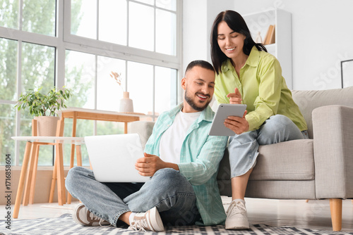 Young couple with gadgets shopping online at home. Cyber Monday