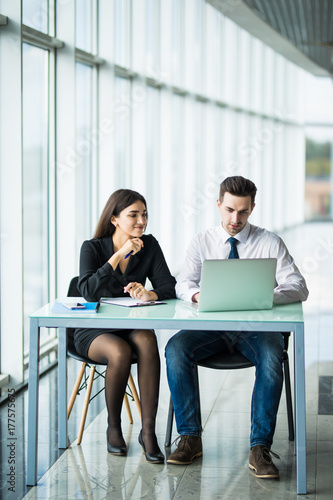 Young couple working together on a laptop in the office. Teamwork concepts.
