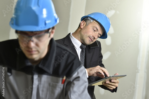 construction, men at work, builder, craftsman, contractor, working, home, house, man, architect, engineer, building, site, tablet, touchpad, checking, artisan, foreman, supervisor, male, caucasian, architecture, indoor, occupation, professional, blue, people, background, protection