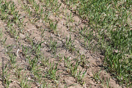 Young crops on soil. Fresh plants growing. Agricultural field spring. Early wheat farming. Green shoots sprouting. Dry dirt background. Rural farmland landscape. Seasonal food production.