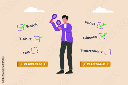 Young Customers using magnifying glass in both hands searching and check list for shopping at flash sale time