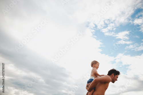 Young dad having fun with toddler son on tropical beach - shoulder ride